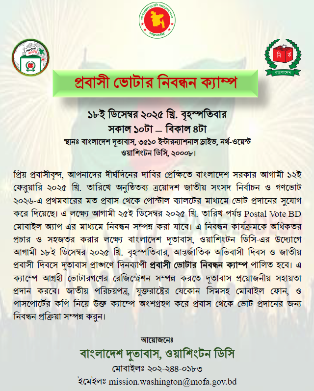 বাংলাদেশ দূতাবাস ওয়াশিংটন ডিসি প্রবাসী ভোটার নিবন্ধন ক্যাম্প আয়োজন করছে